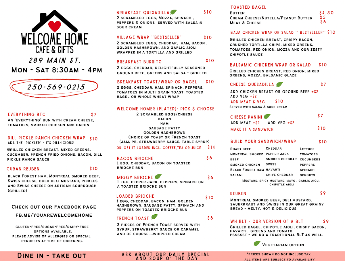 Overall, Welcome Home Cafe & Gifts delivers an eclectic mix of options, combining familiar classics with innovative dishes, all set in a welcoming and cozy atmosphere. The menu offers something for everyone, whether you're craving something light and fresh or indulgent and filling.